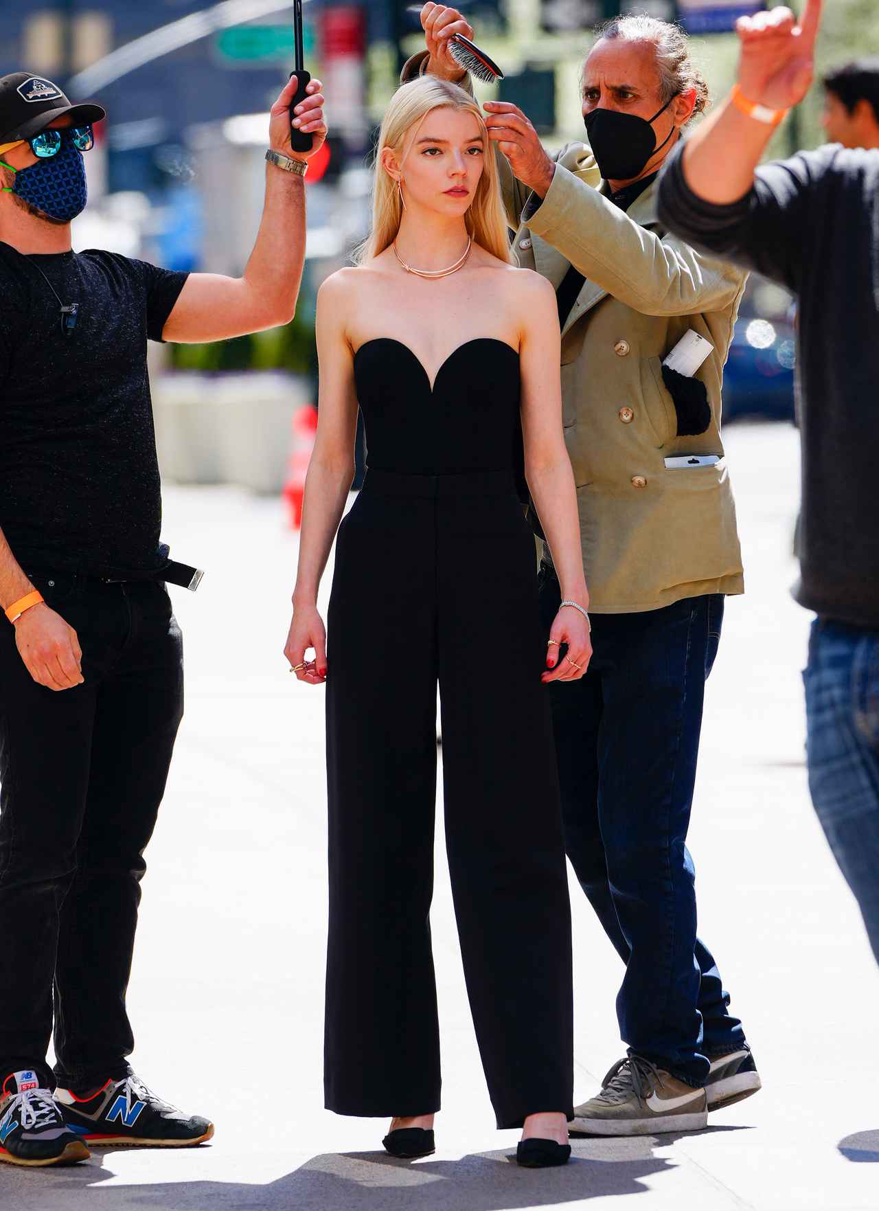 アニャがこの日に着用していたのは、黒のビスチェトップスに、黒のダブルブレストジャケット、黒のワイドレッグパンツという、全身をブラックで統一したコーデ。モデル出身ということもあり、撮影中の表情が様になっているのはもちろんなのだけれど、オフショットの姿も、見事に画になっている。