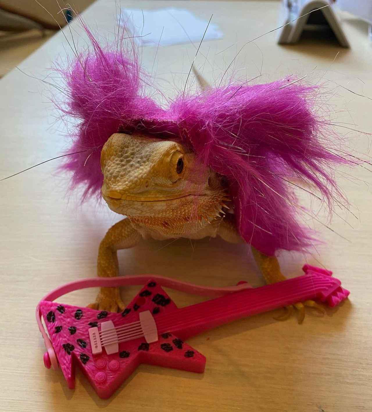 続いて、お次はラッパー風から打って変わって、パンクロッカー風の1枚。パープルのウィッグを被り、ピンクのギターを前に表情を決めている。きちんと前足でギターを持っているというのもポイント。