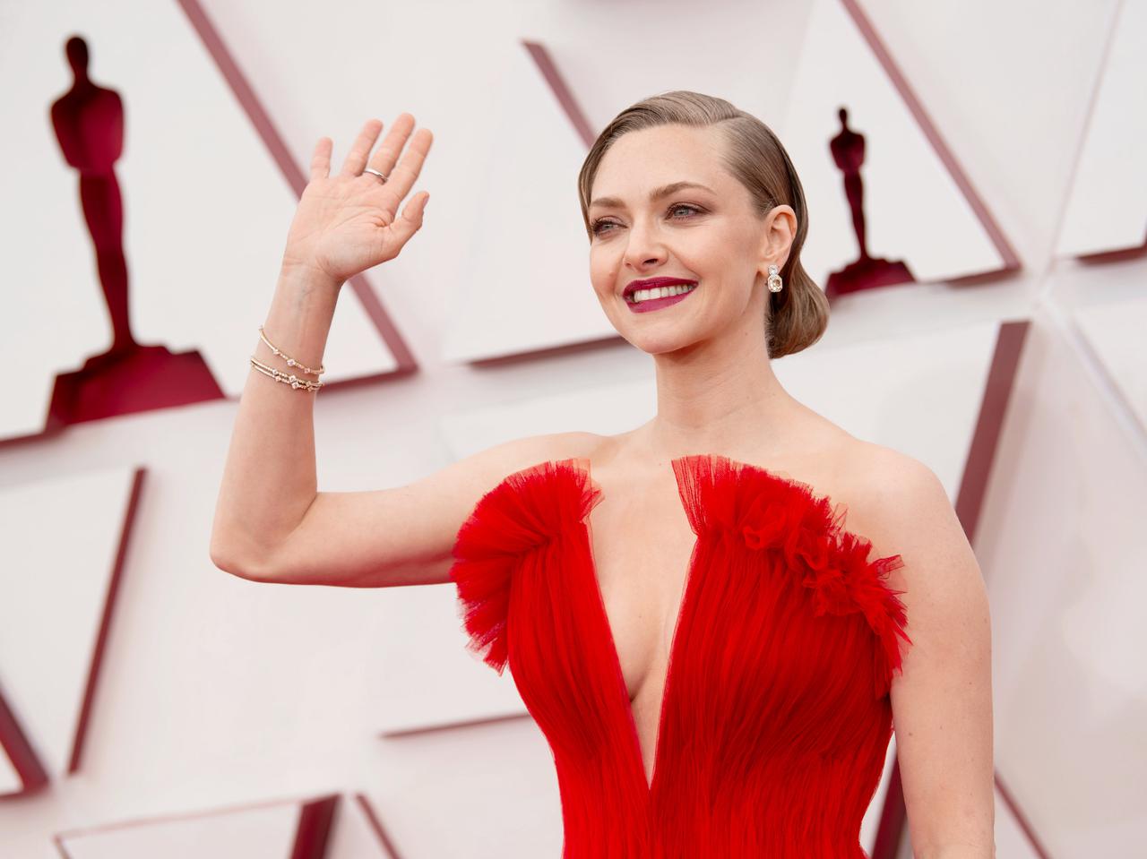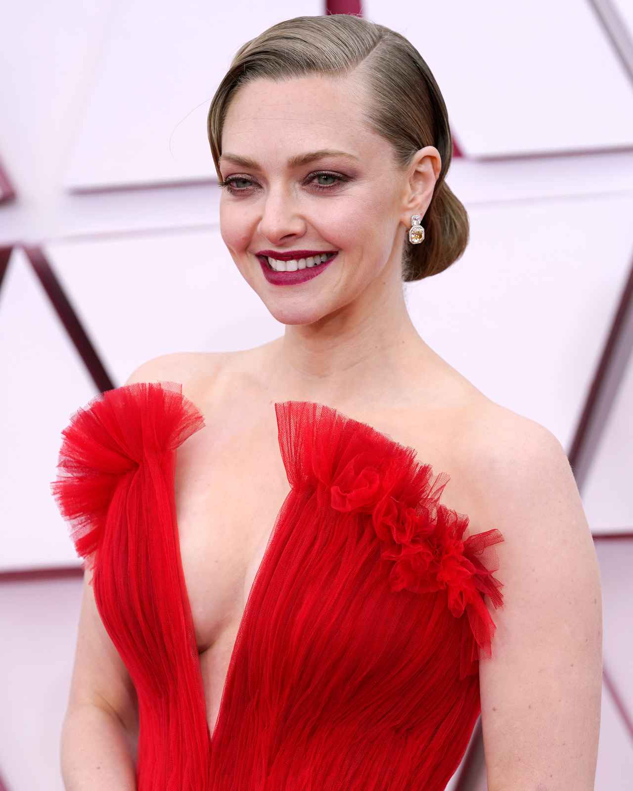 デヴィッド・フィンチャー監督の映画『Mank/マンク』でアカデミー賞助演女優賞にノミネートされた俳優のアマンダ・サイフリッドは、深みのあるバーガンディーレッドのリップに、紫がかったスモーキーアイを合わせて優雅なムードに。パーティシーンにふさわしい低めのシニヨンも素敵。