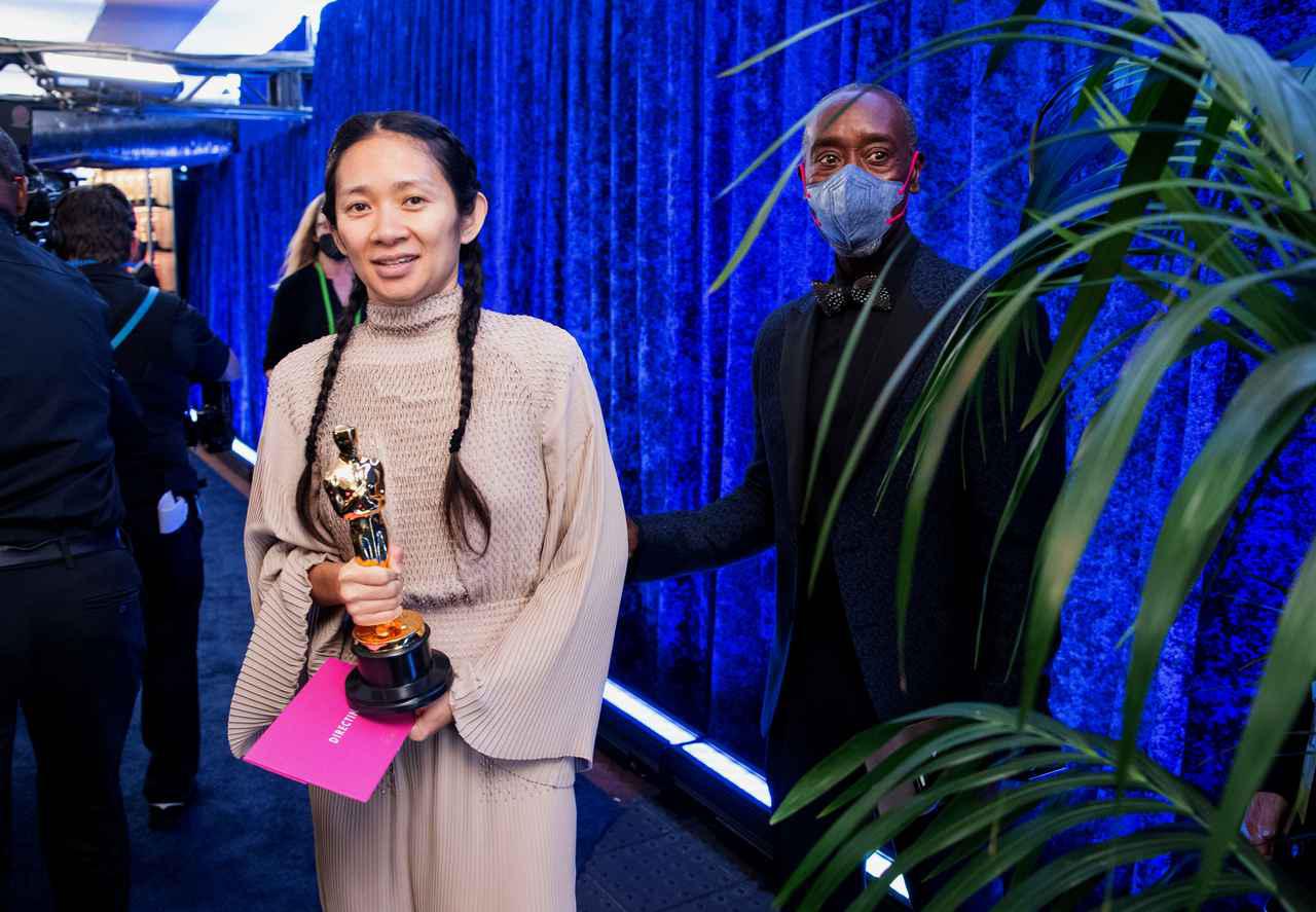 『ノマドランド』でアジア系女性として初の監督賞に輝き、さらに作品賞も受賞したクロエ・ジャオ監督がバックステージでカメラを向けられ笑顔を見せた。プレゼンターとして授賞式に参加したドン・チードルもちゃっかり写り込み。