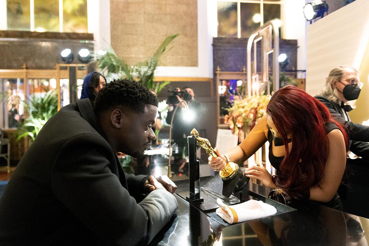 『ジューダス・アンド・ザ・ブラック・メサイア(原題)』で助演男優賞を受賞したダニエル・カルーヤが、オスカー像に自分の名前が刻まれる瞬間をじっと見つめているところに遭遇。