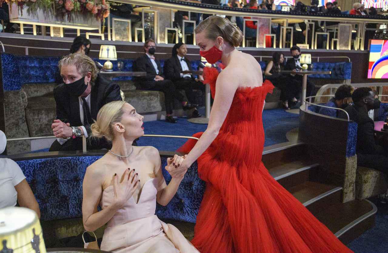 映画『プロミシング・ヤング・ウーマン』の主演俳優キャリー・マリガン(写真右)と、同作品の監督で脚本賞を受賞したエメラルド・フェネル監督(写真左)がコロナ対策のマスクをしておしゃべり。アカデミー賞授賞式の出席者は“テレビ番組の出演者”とみなされるため、カメラが回っているあいだはマスクをはずすことが許されていたが、それ以外の場面ではマスク着用を厳守。