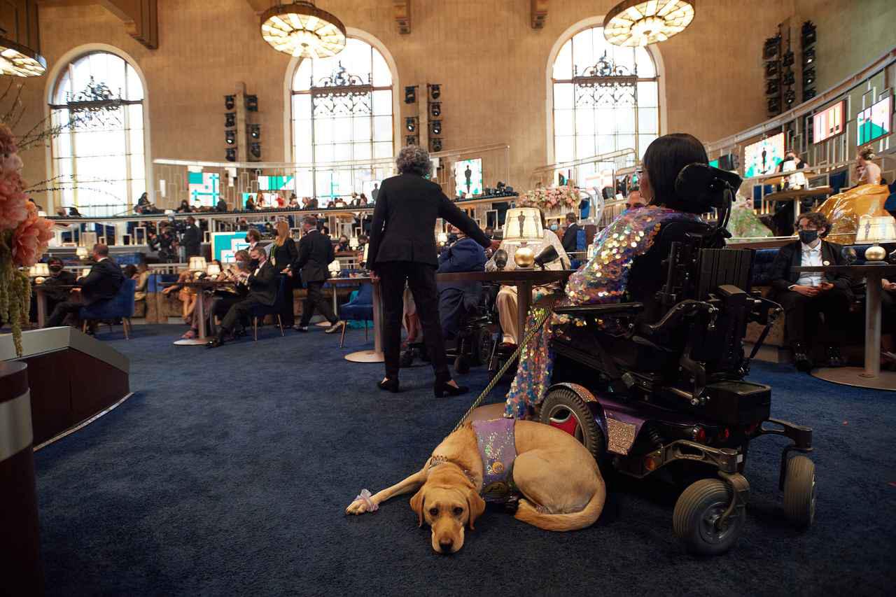 長編ドキュメンタリー賞のノミネート作品『ハンディキャップ・キャンプ:障がい者運動の夜明け』のジム・レブレヒト監督の同伴者として参加した女性が連れていた介助犬が、会場でくつろぎモードに。ちなみに、飼い主のドレスに合わせて、介助犬が着ているベストもキラキラ素材のオスカー仕様。