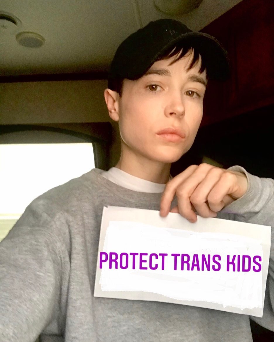 エリオット・ペイジはインスタグラムに「トランスキッズを守ろう」というメッセージが描かれた写真を投稿。©Elliot Page/Instagram