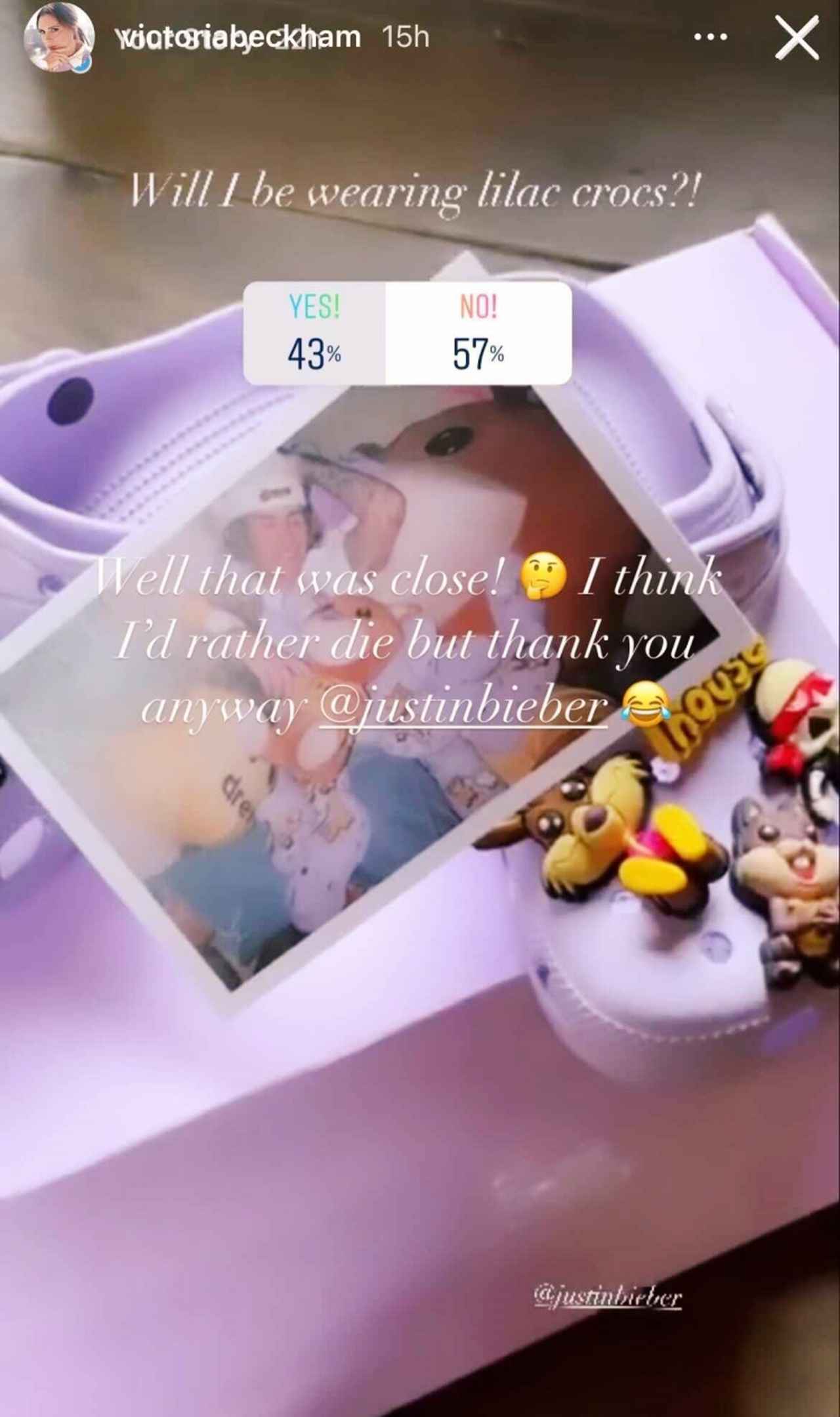 そんなよしみで、ジャスティンからクロックスとのコラボ商品が送られてきたというヴィクトリアは、インスタグラムストーリーを通じてその写真を公開。「たくさんの人たちから、(新型コロナの)ロックダウンが終わったらどんなアイテムを身につける予定かって質問が来るけど、ジャスティン・ビーバーからの提案について、みなさんどう思う? 」とフォロワーたちに向けて、自身がクロックスを履くのは「アリかナシか? 」という投票を実施した。