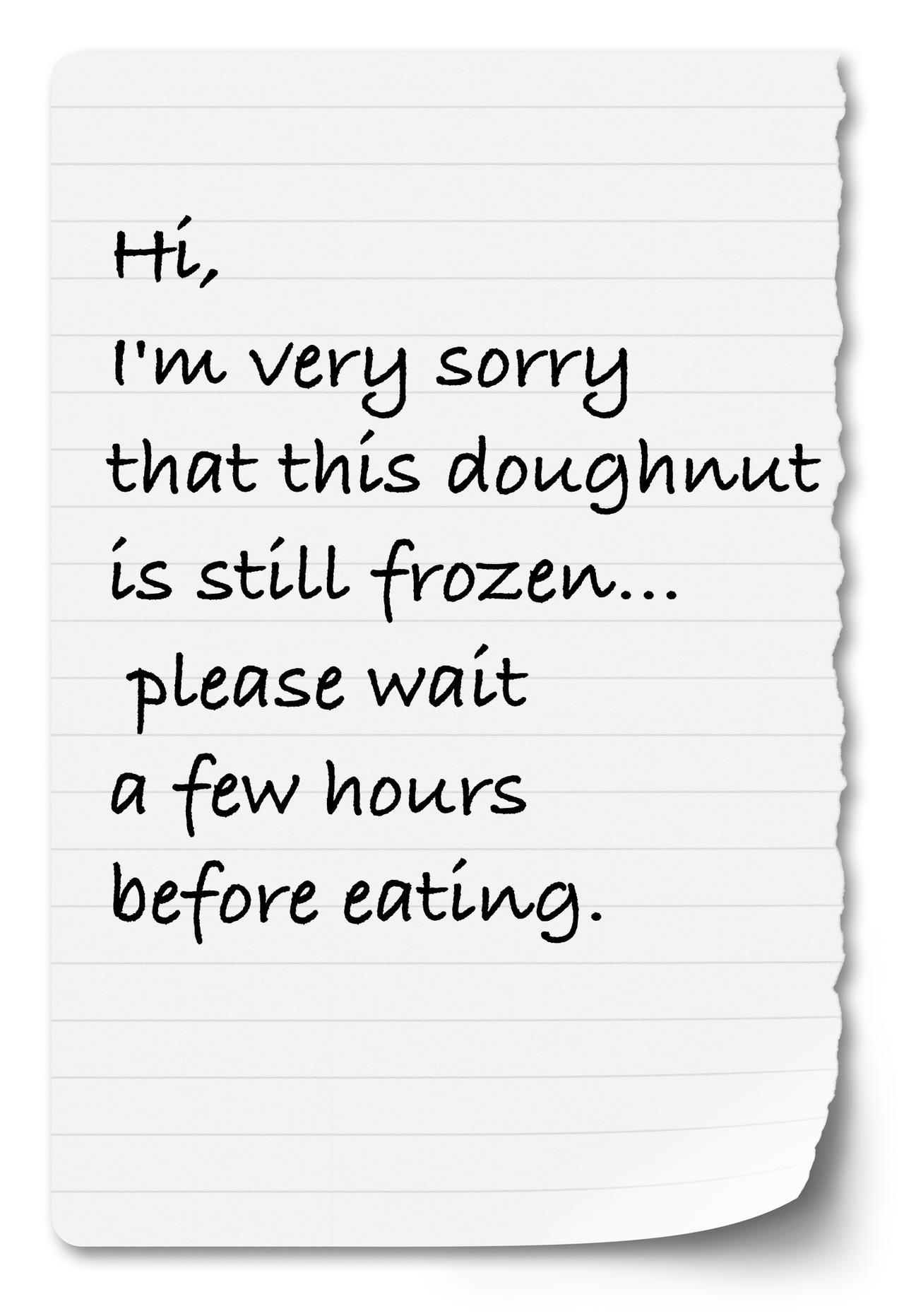 「大変申し訳ありません。このドーナツはまだ凍っています…。なので、数時間ほどお待ち頂いてからお召し上がりください」