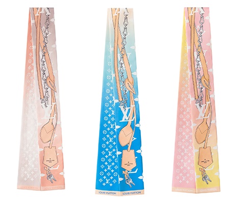 まずは、「バンドー・モノグラム プール」。メゾンのアイコニックなレザーグッズと共鳴するチェーン、ストラップ、タブのグラフィックが印象的な 「バンドー・モノグラム プール」は、 溶け合うような色使いで描いた背景に、モノグラム・パターンと優美なプリントのコントラストが際立つデザイン。ブリューム、ブルー、ローズの3色展開。