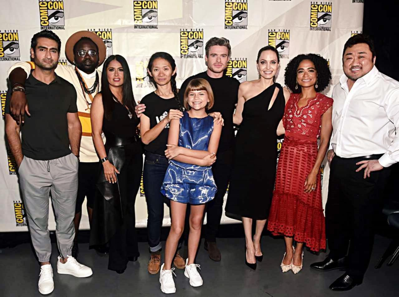 ジャオ監督と『エターナルズ』のキャストたち。左から:クメイル・ナンジアニ、ブライアン・タイリー・ヘンリー、サルマ・ハエック、クロエ・ジャオ、リア・マクヒュー、リチャード・マッデン、アンジェリーナ・ジョリー、 ローレン・リドロフ、 マ・ドンソク。