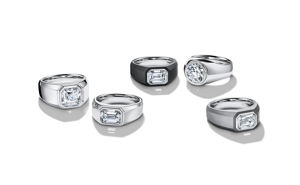 ティファニーが男性用に初めて提案するダイヤモンドのエンゲージメントリングは、伝統的な男性用ウェディングバンドリングから大胆に進化。