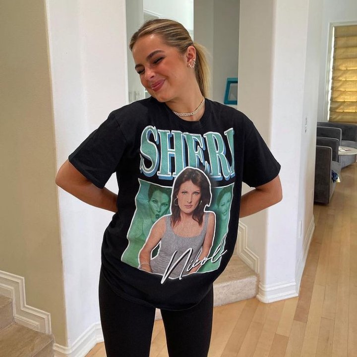 一見すると普通の格好だが、胸のところにデカデカと「SHERI」の文字と女性の写真がプリントされたTシャツをよく見たら、描かれているのは人気セレブではなくアディソンの母シェリ・イースターリング! じつは、上の写真が撮影された日は「母の日」で、このグラフィックTはアディソンが母シェリへの日頃の感謝の気持ちと愛を伝えるためにデザインした特注品。