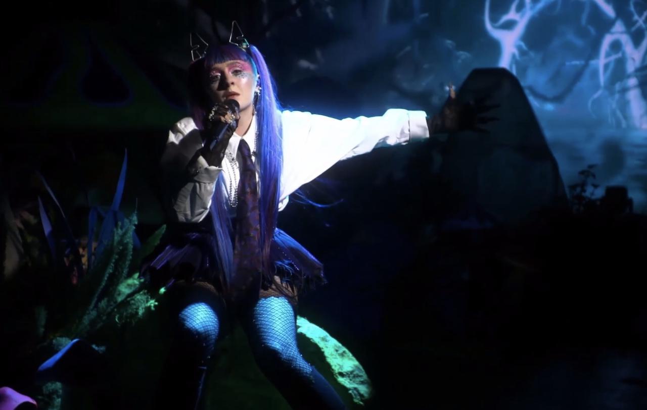 アシュニコのオンラインライブは、「Tantrum」からスタート。ブルーのツインテールにピンクのメッシュを入れ、彼女が好きな『美少女戦士セーラームーン』のコスチューム並にミニの黒スカートを履いて、白ブラウスに黒ネクタイと、学生服っぽい衣装で登場したアシュニコは、頭にはデビルの角がついており、アイメイクはピンクとブルーのシャドウの上にクリスタルらしきキラキラが散りばめられている。