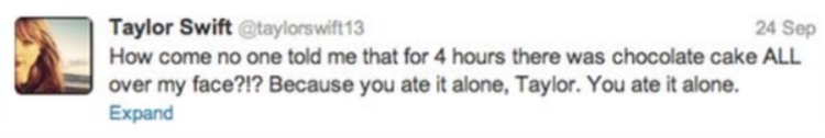 「この4時間のあいだ、どうして誰も私の顔がチョコレートケーキだらけだって教えてくれなかったの?!? それは1人で食べたからだよ、テイラー。1人で食べちゃったから」