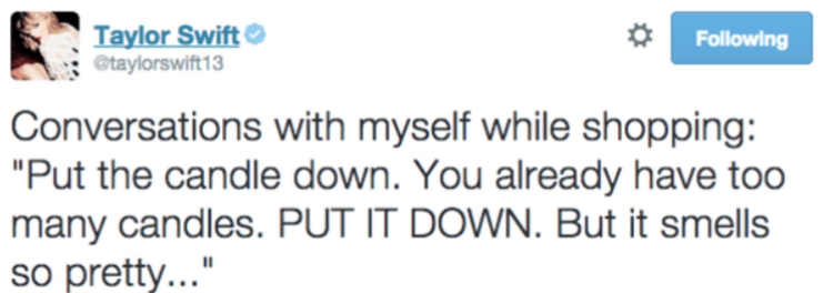 「ショッピング中の自分との会話:『キャンドルを戻しなさい。もういっぱい持ってるでしょう。戻しなさい! でも、めちゃくちゃいい匂いだな…』」
