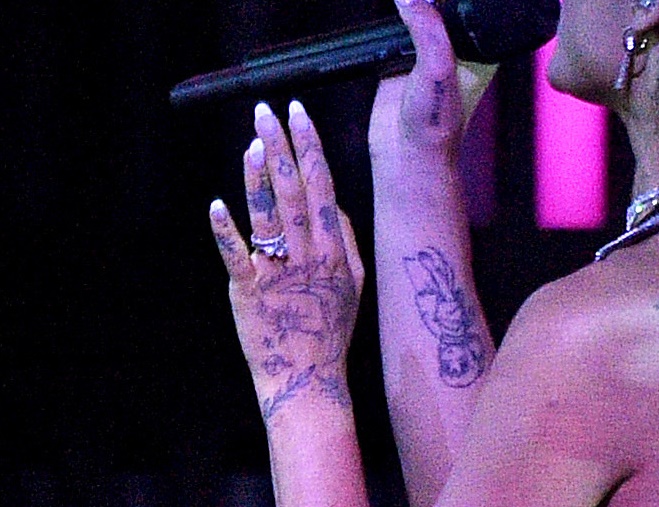 結婚後初めてのパフォーマンスということで注目されたのは、アリアナの左手の薬指。アリアナは婚約指輪と結婚指輪と思われる2つの指輪を左手の薬指につけており、パフォーマンス中も指輪がキラリと輝いていた。