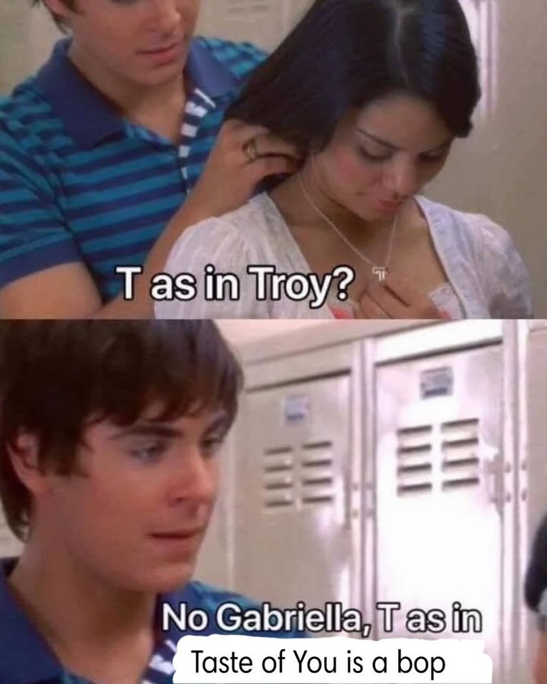 映画では、「トロイのT?」とガブリエラが聞き、トロイが「そうさ」と返すこのシーンだが、ダヴがアップした画像ではトロイのセリフが書き換えられていて、トロイがガブリエラに「違うよ、ガブリエラ。『『Taste Of You』は最高の曲だ』のTだよ」と返すものになっている。