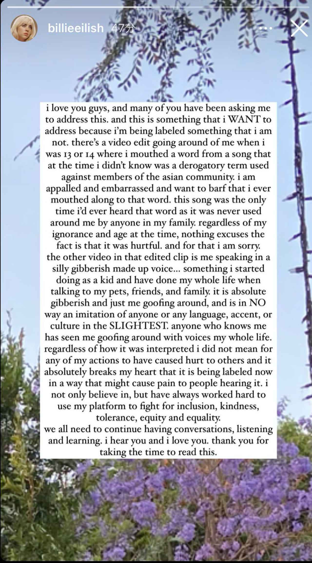 これまでこの件について沈黙を貫いてきたビリーだったが、日本時間6月22日にインスタグラムストーリーに声明を発表して、この件について初めてコメントを発表。そのなかで、当時13歳か14歳だった自分は口ずさんだ言葉がアジア系コミュニティに対する蔑称だったことは知らなかったものの、自身の年齢や無知さは言い訳にならないとして、口ずさんだ事実を謝罪したほか、アジア系の人々のアクセントをバカにしたのではとされる疑惑については否定した。