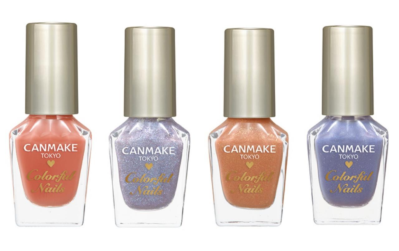 キャンメイク「カラフルネイルズ」左から N51コーラルピンク<新色>、N52 マーメイドスケール<新色>、N53 ダズリングサン<限定色>、N54 スパークリングラグーン<限定色>、N49 各396円(税込)