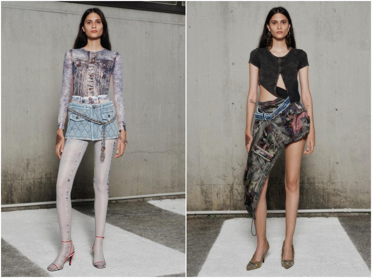 DIESELのヘリテージを再解釈したレーザープリントも大胆に取り入れ、ブレザー、シャツ、デニムパンツにはレイヤーとシームのだまし絵のような効果を生み出し、セカンドスキンのようなジャージーには、デニムのウォッシュ加工やDIESELのアーカイブパッチを全面的にプリントしている。