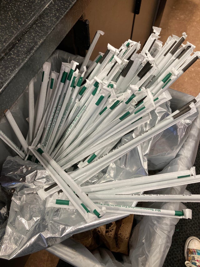 ゴミ箱に廃棄された大量のストロー。しかも、どれも使われた形跡はなく全部「未使用」の状態。もったいないという言葉に尽きるが、そもそもなぜこんなことになってしまったのか? その理由はこの写真に添えられていたメッセージにあった。