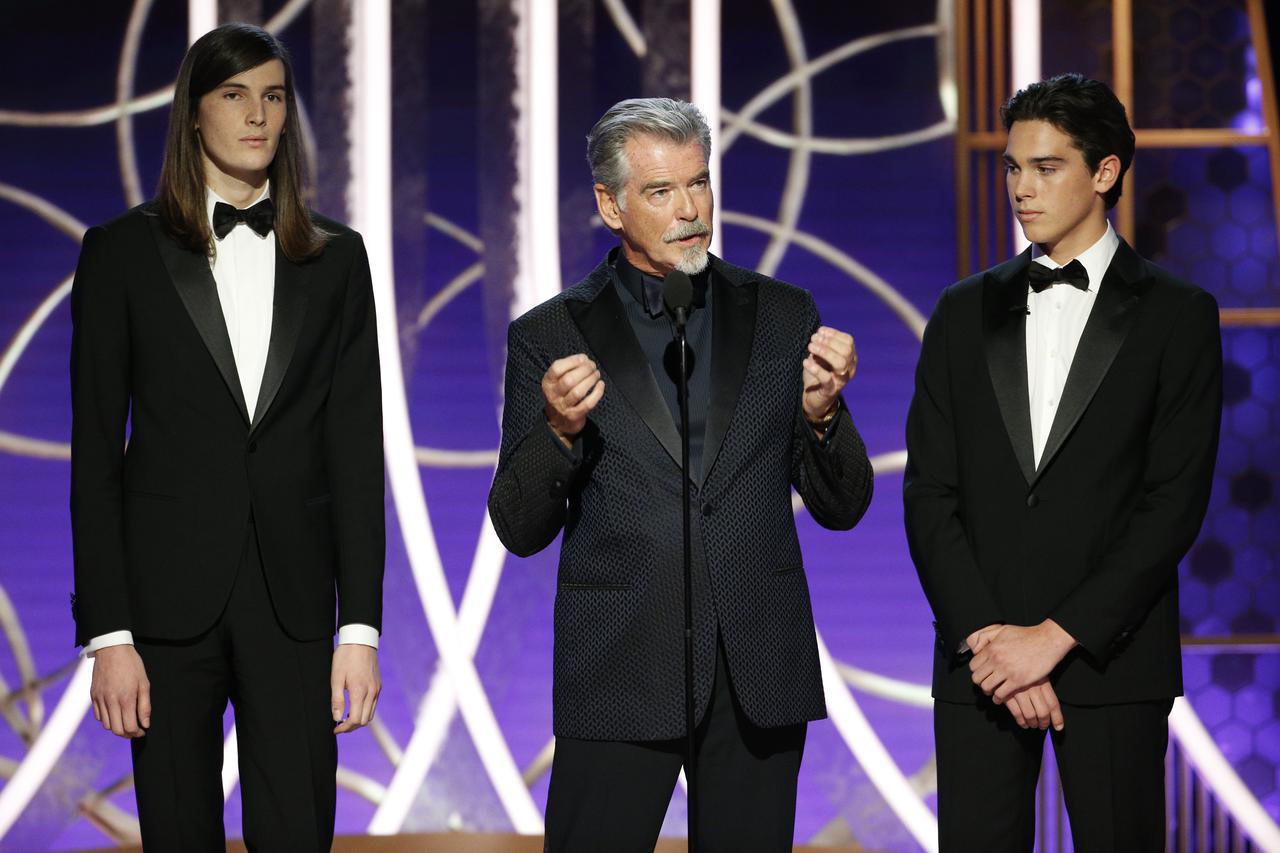 2020年の第77回ゴールデン・グローブ賞でアンバサダーを務めたピアースの息子ディラン(左)とパリス(右)。