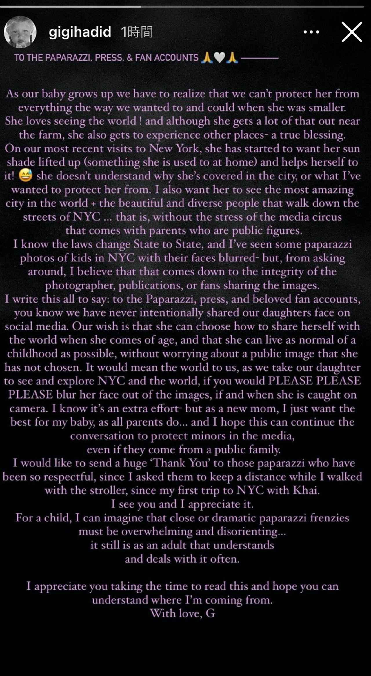 今回、ジジはインスタグラムストーリーズに「パパラッチやプレス、ファン・アカウント」に宛てた長文を投稿して、カイの写真を撮影する人々に向けたお願いを綴った。