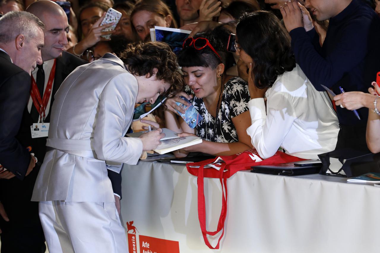 第76回ヴェネツィア国際映画祭でファンのノートにサインするティモシー・シャラメ。