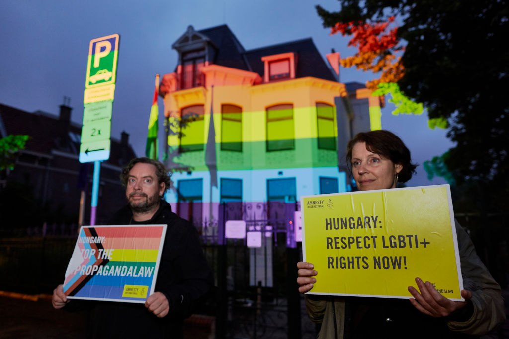 6月25日、国際人権NGOのアムネスティ・インターナショナルが抗議のために、プロジェクターを使ってオランダのハンガリー大使館を虹色に変えた。