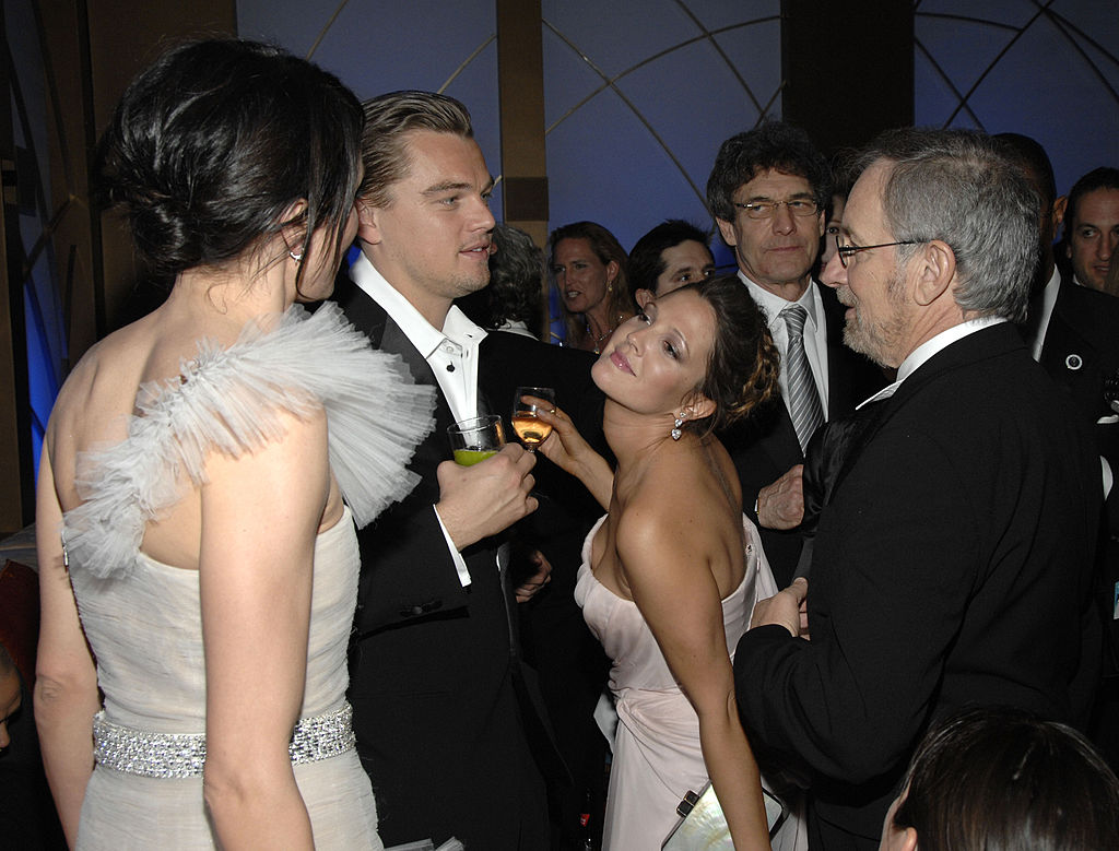 2007年、ゴールデン・グローブ賞のアフターパーティーにて。ちなみに手前は当時黒髪だったドリューの親友キャメロン・ディアス。右端の男性はスティーブン・スピルバーグ監督。