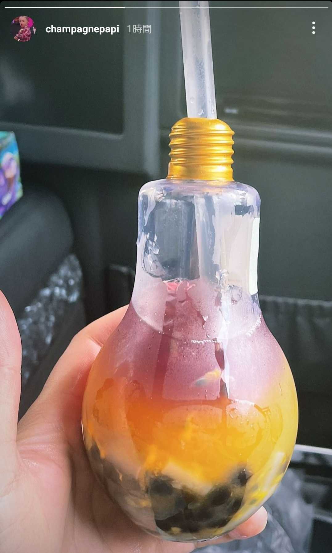 それは、電球に模した入れ物に入れられた電球ドリンクというもの。日本でも2017年頃に若者を中心に、インスタ映えアイテムとして流行った電球ドリンク。とくにコメントはしていないがドレイクは満足いったようで、タピオカ入りの電球ドリンクを飲んでいる様子をインスタグラムで公開した。