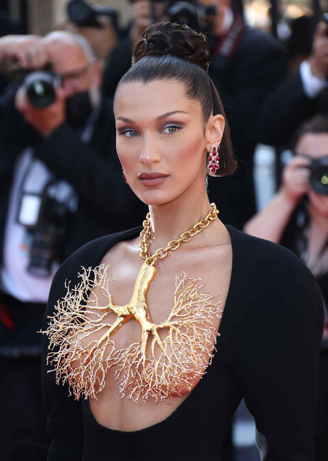 この日ベラが着用していたのは、襟ぐりが胸下まで大胆にあいたスキャパレリ(Schiaparelli)のロングドレス。カットアウトが大胆なため、そのままだと胸は丸見え状態。そこでベラは、ラインストーンがあしらわれたゴールドの肺のだまし絵のようなネックレスで胸をカバーし、アーティスティックなスタイルへと仕上げた。