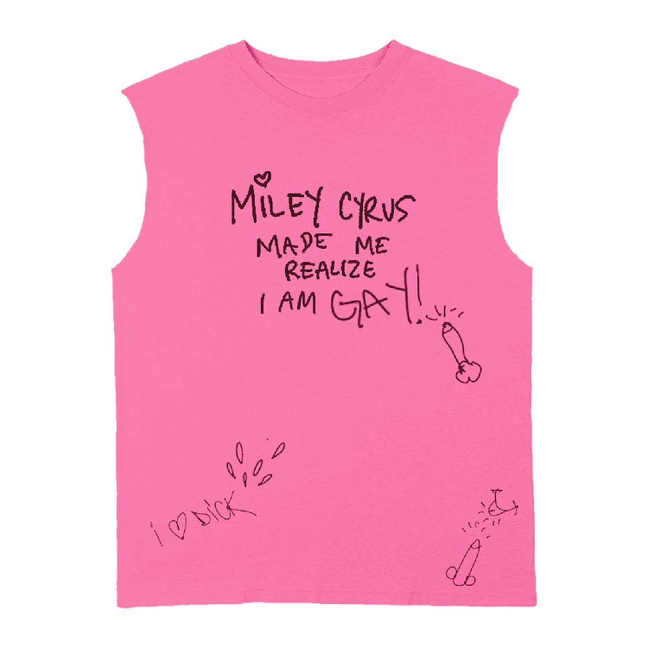 なかでも、定価35ドル(約3,800円)で販売されているバブルガムピンクのノースリーブTシャツは、マイリ―による「Miley Cyrus Made Me Realize Iam Gay(マイリ―・サイラスが僕/私にゲイだと気づかせた)」「I(ハート)Dick(男性器が大好き)」という手書きのメッセージや、男性器やオーラルセックスを模したイラストがプリントされた、LGBTQ+への理解やサポートと開放的な性を応援する1枚に。