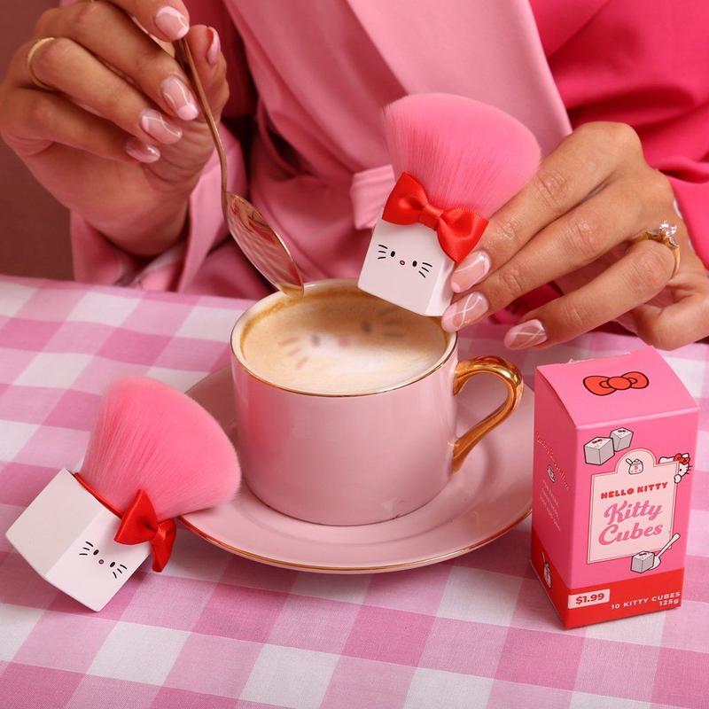 フェイスパウダーやブロンザーを塗るのに最適なカブキブラシは、ブランチタイムに欠かせない角砂糖をモチーフにしたデザイン。角砂糖形の持ち手の部分にはハローキティの顔が描かれているだけでなく、トレードマークのリボンもついていることでキティっぽさ全開。