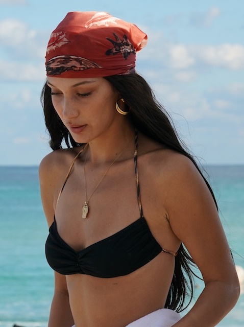 ビーチでのスカーフアレンジは、2019年にモデルのベラ・ハディッドやケンダル・ジェンナーが取り入れて以降セレブの間でも人気を集めていたけれど、ここにきて本格的にトレンド入りしている。