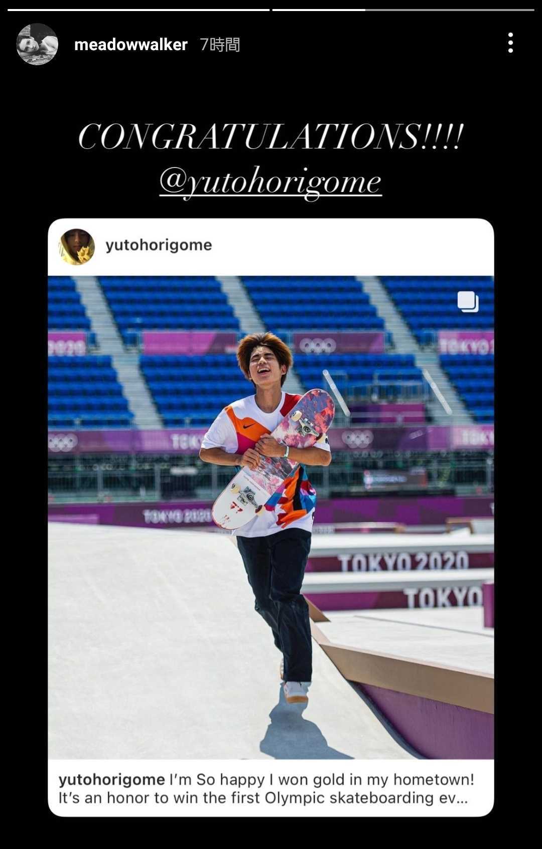 そんなメドウが自身のインスタグラムのストーリーズで「おめでとう!!!!」と、堀米選手が金メダルに輝いたことを祝福。