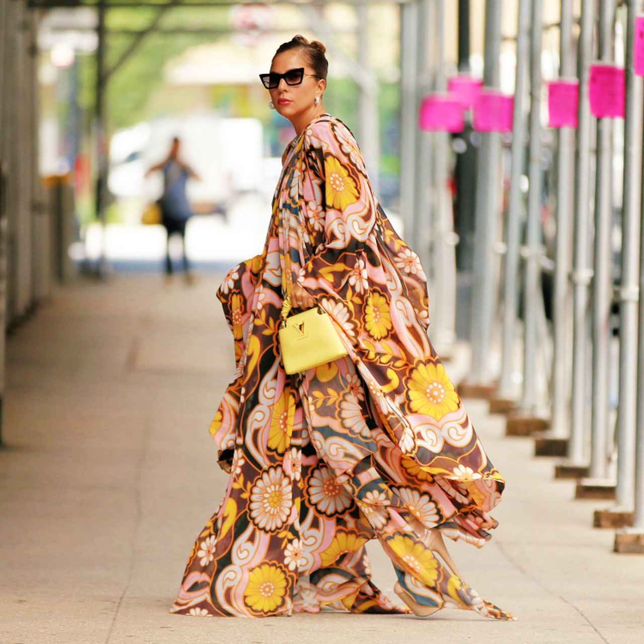 この翌日には、ほかの日とは打って変わって1970年代風のレトロなフラワープリントのマキシワンピにルイ・ヴィトン(Louis Vuitton)のイエローのミニバッグを合わせてバリエーションをきかせていた。