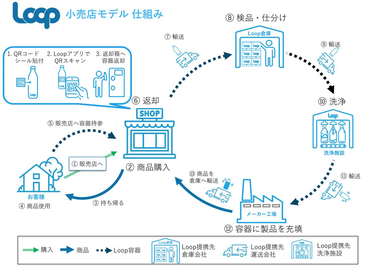 小売店モデルでは、Loopと提携している小売店で製品を購入し、使用後には基本的に購入店舗にある返却ボックスに容器を返却する。日本では、現段階ではイオンと提携しており、東京、神奈川、千葉にあるイオンのうち19店舗で購入と返却ができる。