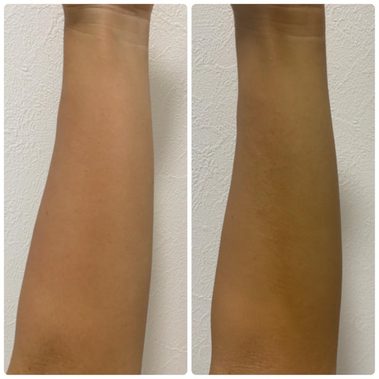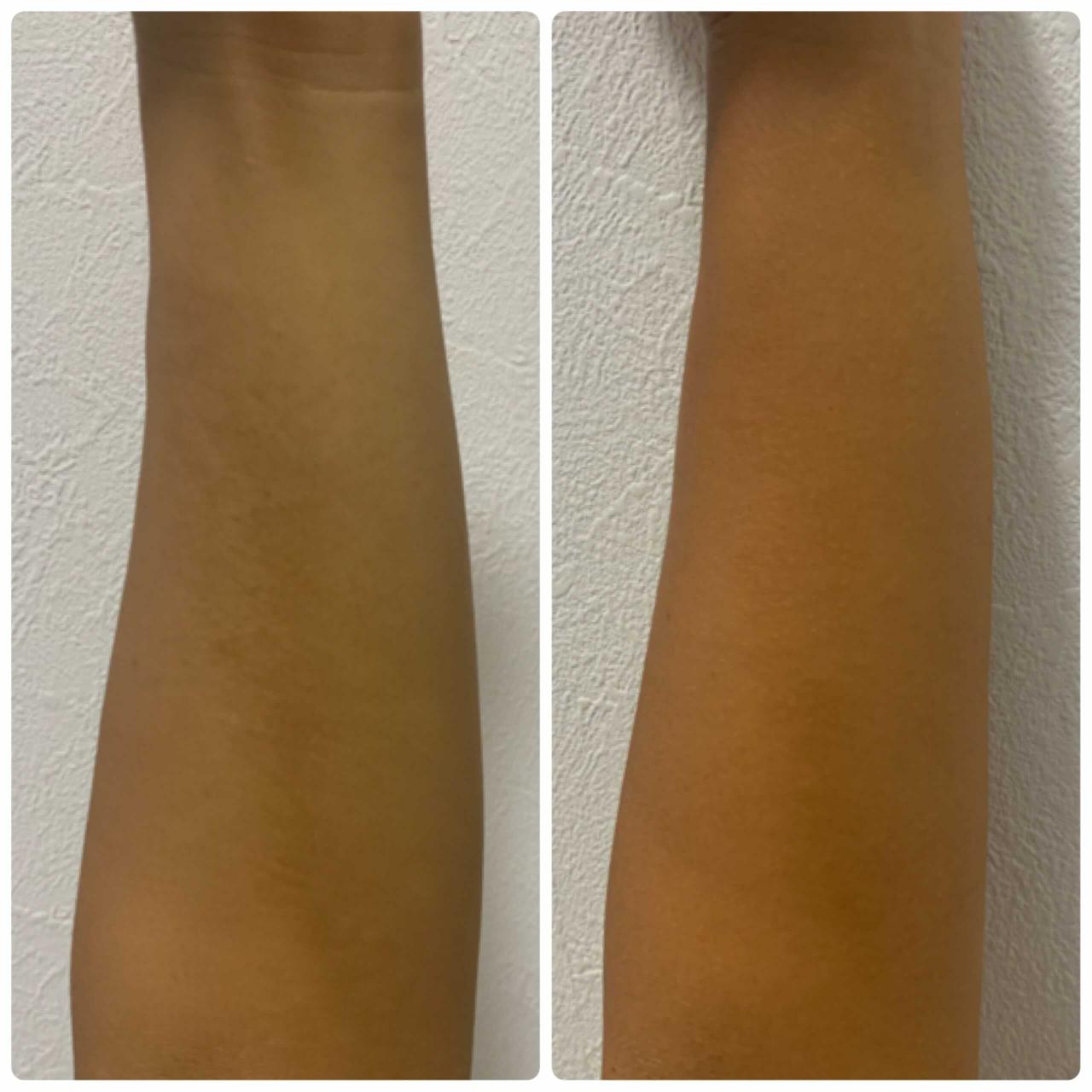 以前別のセルフタンニングを使用したときには、実際に日焼けしたときとは異なる不自然なオレンジっぽい色になってしまい、ムラもできてしまったことがあるため、このリアルな仕上がりには正直驚き。