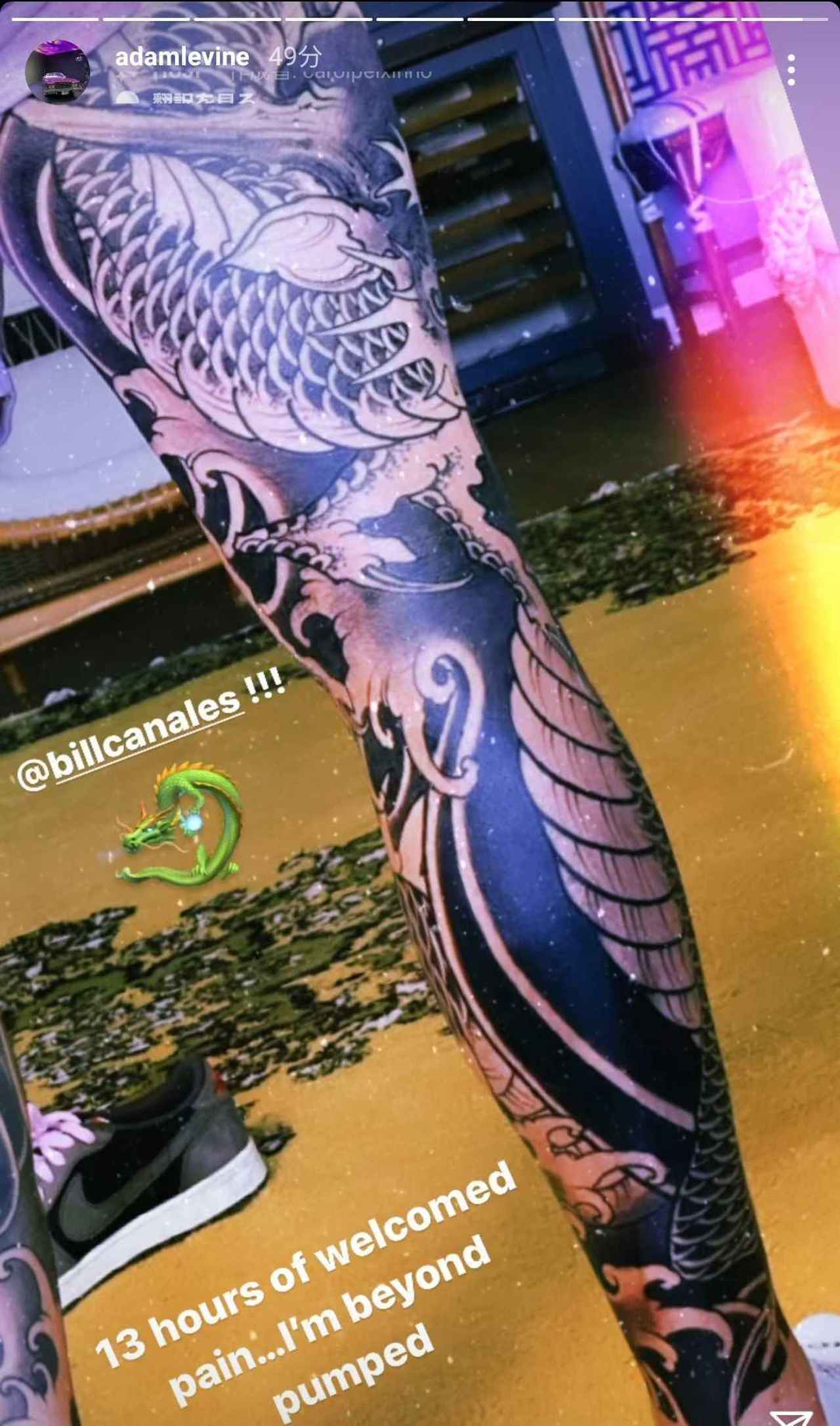 「神奈川沖浪裏」に着想を得たタトゥーを入れた時は、完成までに3日要したが、今回2日と13時間で完成。しかし、その過程はどちらも壮大なもので、アダムのタトゥーを担当したタトゥーアーティストのビルはその一部始終をインスタグラムで公開し、「2日と13時間。アダムは控えめに言っても真の戦士であり、偉大な人物であることは間違いない」とキャプションをつけた。