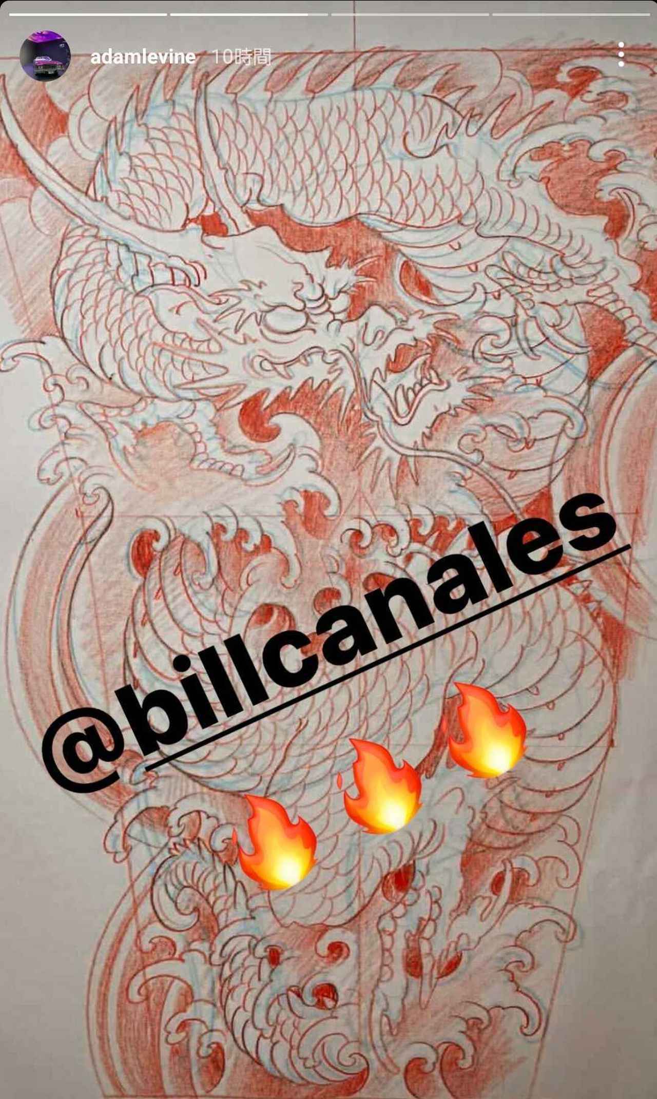 そして今回、左脚に巨大なタトゥーを入れたが右脚はあいていたため、右脚も左脚同様に巨大タトゥーを入れることに。アダムは右脚に入れるタトゥーの原画を公開しており、そこには龍のデザインが。