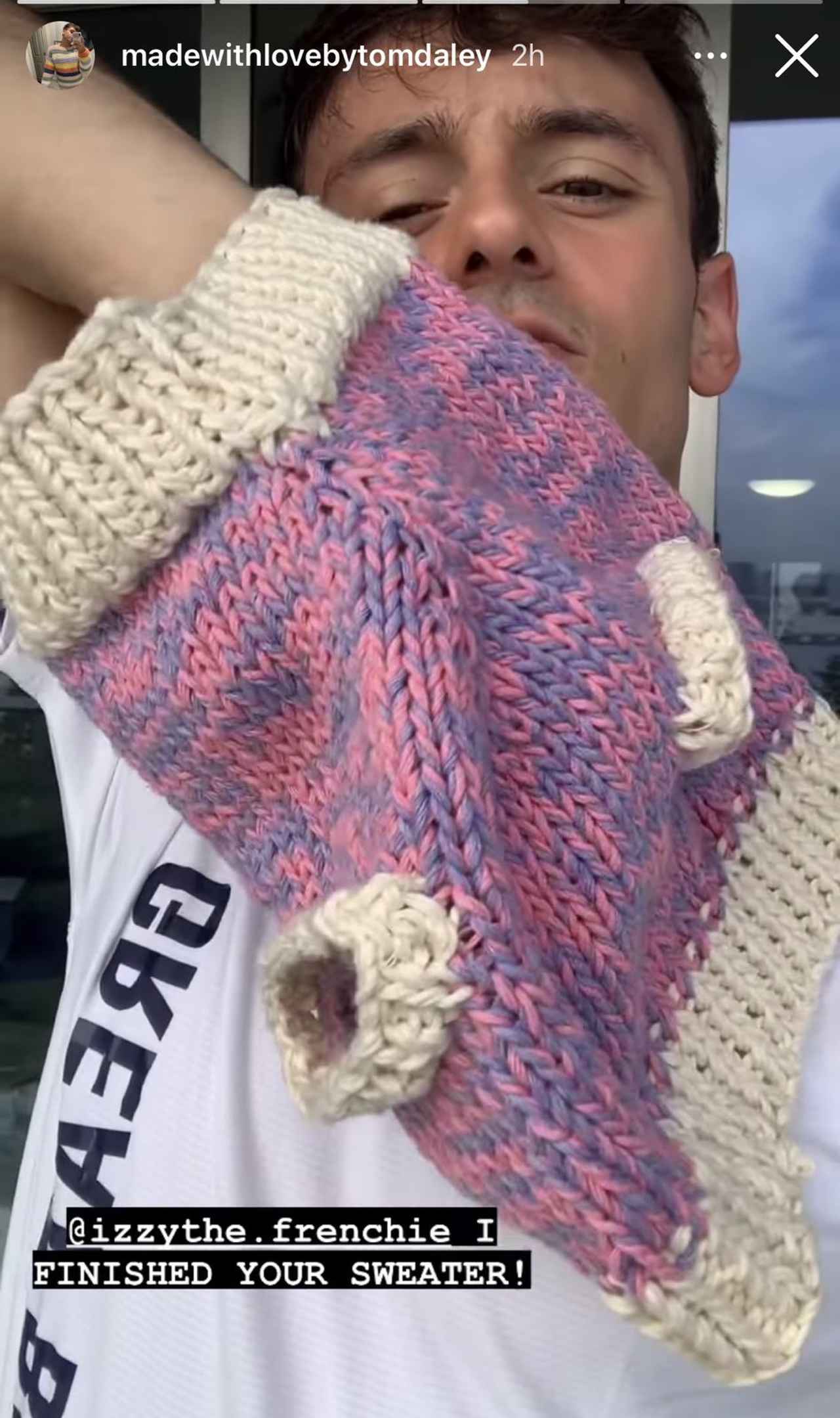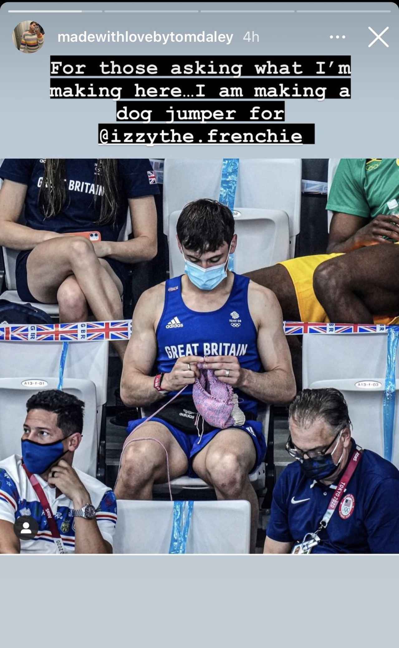 一体何を編んでいるのかと話題になっていたが、トムはインスタグラムに「ここで何を作っているか聞かれるんだけど、イジーのために犬用のジャンパーを作っていたんだ」と、SNSで有名なフレンチブルドッグのためのジャンパーをオリンピックの観客席で作っていたことを明かした。