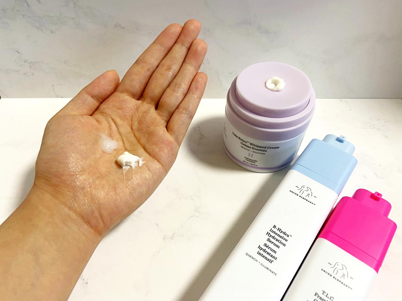さっそく、肌表面をなめらかに整える夜用ジェル美容液「ドランク エレファント ティーエルシー フランブース グリコリック ナイトセラム」(赤いボトル)と、肌の角質層にうるおいを届ける保湿液「ドランク エレファント ビーハイドラ インテンシブ ハイドレーションセラム」(青いボトル)、アフリカンオイル配合のクリーム「ドランク エレファント ララレトロ ホイップクリーム」(紫のボトル)の3つの異なるテクスチャーの製品を、手のひらにワンプッシュずつ出して混ぜ合わせる。