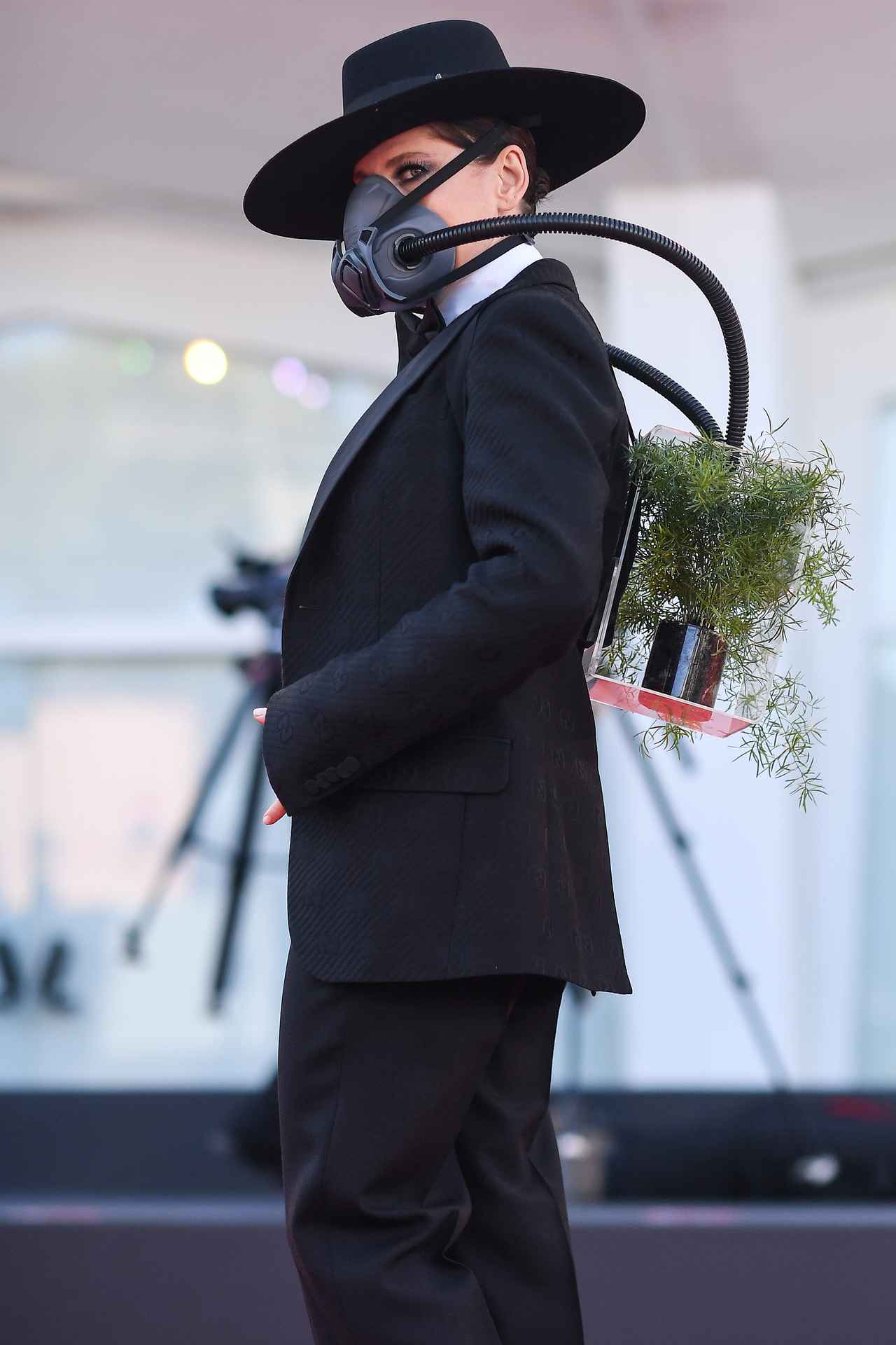 プラットフォームヒールにタキシード風のスーツ着て現れたゲストが身につけていたのは、一見、ガスマスクのように見えるマスク。ただマスクから伸びているホースは、背中に背負われた植物につながっている。自然のフィルターできれいにした空気を吸える、近未来風の植物マスク、といったところだろうか。