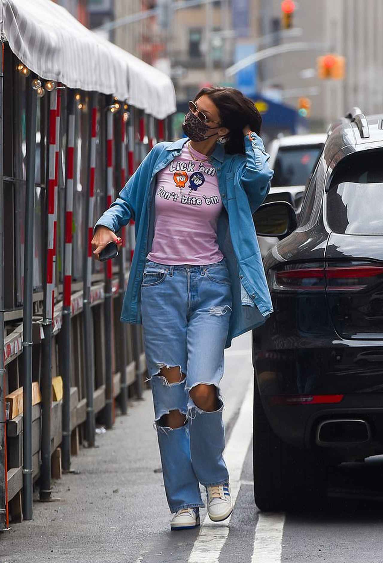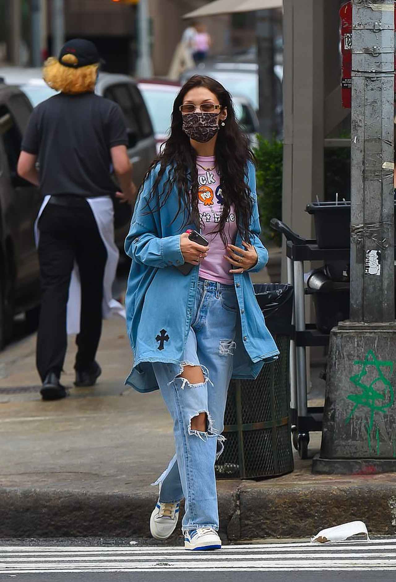 トップモデルのベラ・ハディッドは、Chrome Hearts (クロムハーツ)のメンズのデニムシャツとワイドレッグデニムを合わせたデニムONデニムコーデ。ワイルドなダメージ加工が今の気分にマッチ。
