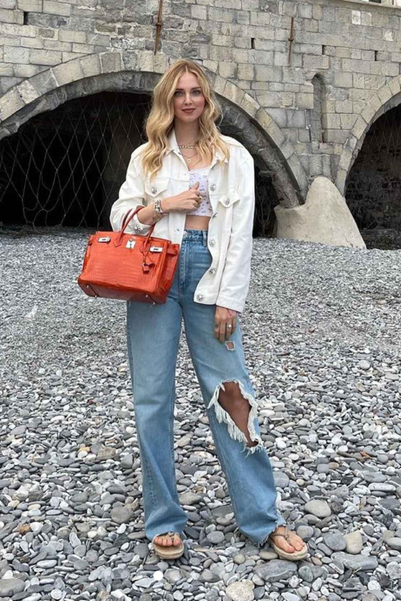 ポップな着こなしが人気のキアラ・フェラーニ。Zara(ザラ)のダメージ加工が効いたワイドレッグデニムには、Miu Miu(ミュウミュウ)のデニムジャケットにを合わせ、キアラお得意のハイ&ローコーデ。