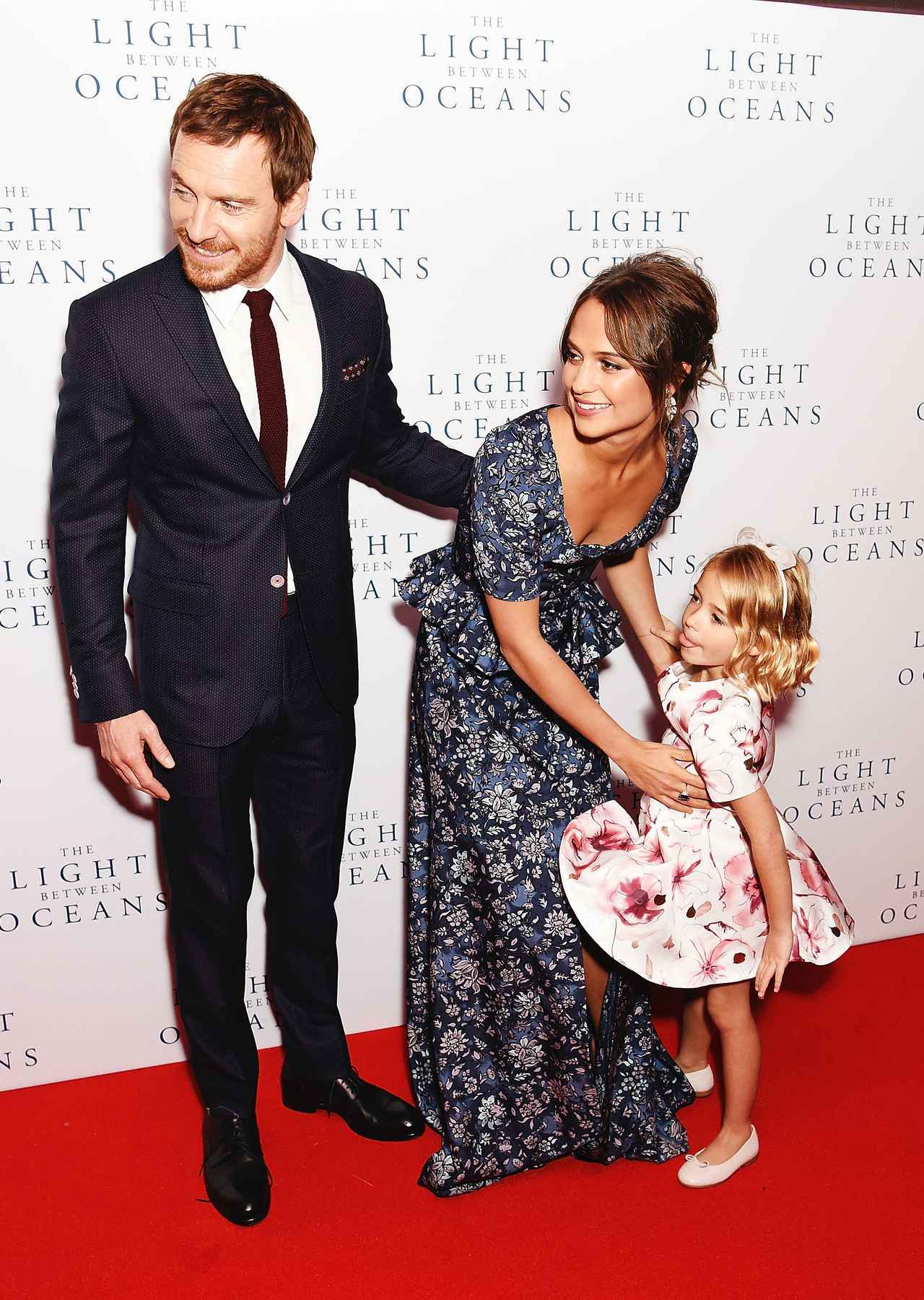映画『光をくれた人』のプレミアイベントで、子役とレッドカーペットを歩くマイケル・ファスベンダーとアリシア・ヴィキャンデル。