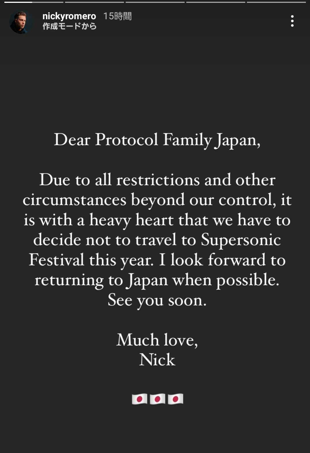 「親愛なる日本のプロトコル・ファミリーへ。我々にはどうすることもできない、あらゆる規制やその他の事情により、今年のスーパーソニックへの渡航を残念ながら断念せざるを得ない。可能となった時に、日本に戻ることを楽しみにしているよ。また近々会おう。たくさんの愛を、ニック」