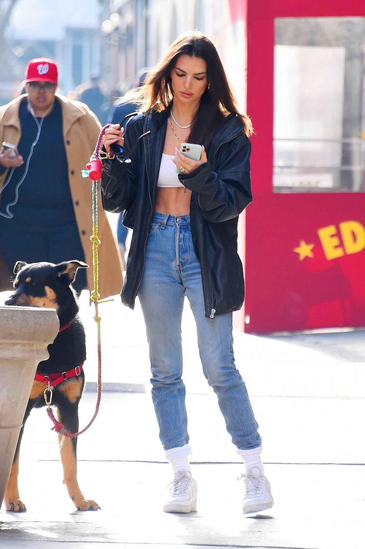 ニューヨークのストリートで愛犬の散歩をする人気モデルの エミリー・ラタコウスキーは、ブラトップにオーバーサイズジャケットを羽織り、ストレートデニムを合わせた旬なスタイル。足元は「エアフォース1」と白のロングソックスを合わせ、デニムの上にソックスを被せるレトロな履き方も注目。
