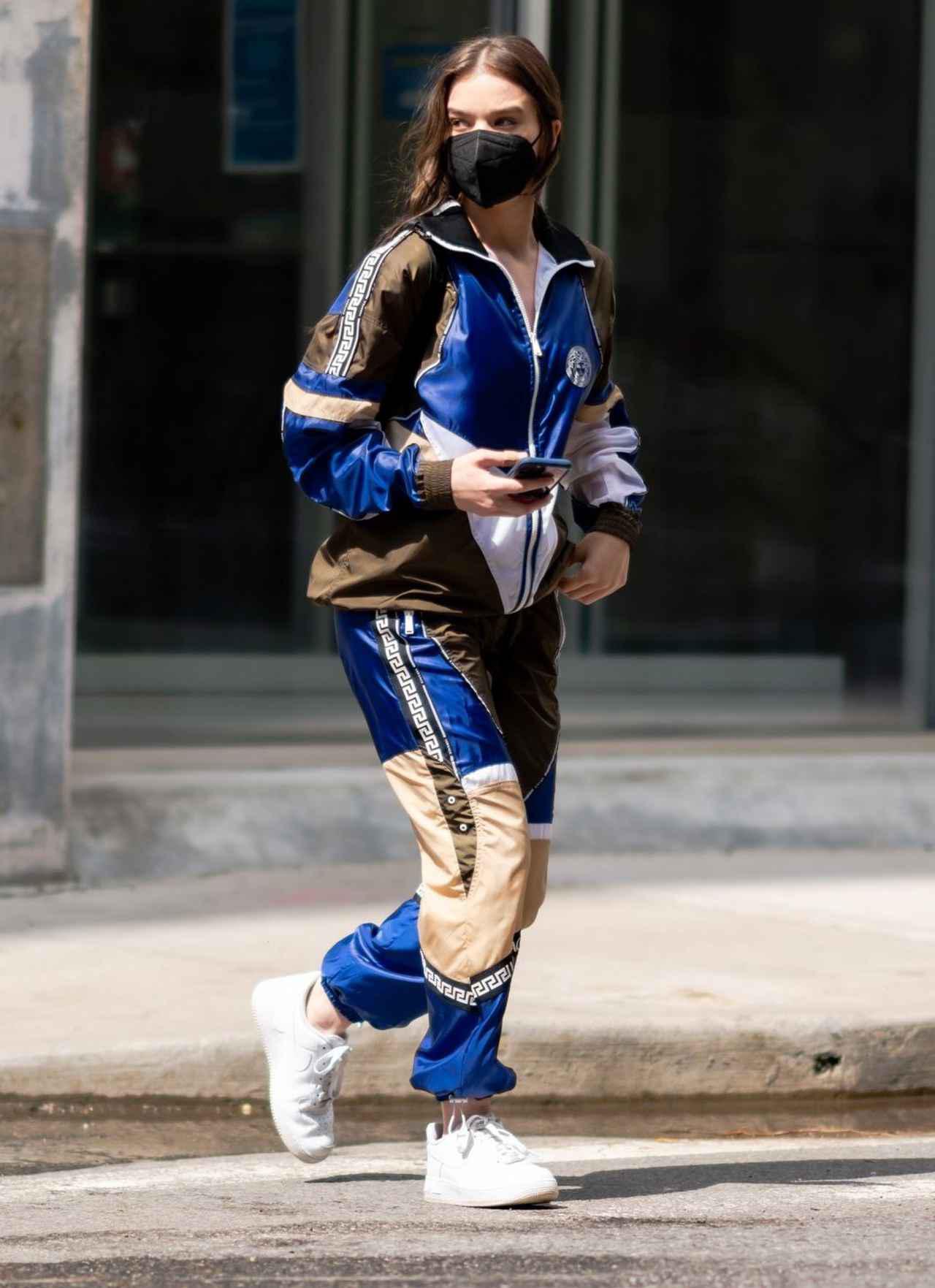 Versace(ヴェルサーチェ)の新作セットアップをポップに着用し、白の「エアフォース1」で抜け感を作った ヘイリー・スタインフェルド。派手なスタイルの足元に適度な抜け感を作る役割も果たす白の「エアフォース1」は、様々な着こなしにマッチする万能スニーカー。