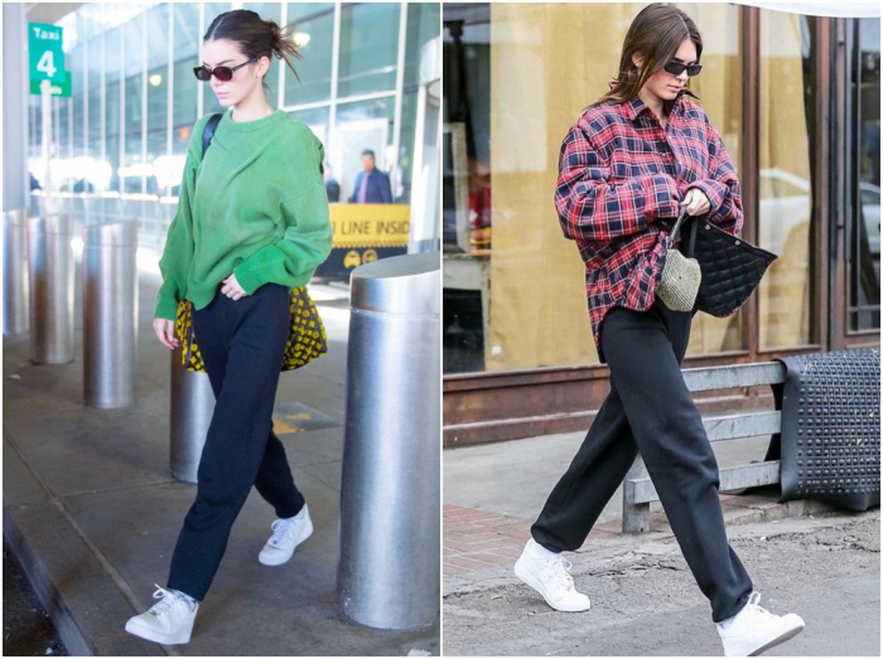トップモデルの ケンダル・ジェンナーは、お気に入りのラフなシルエットの黒のパンツに白の「エアフォース1」を合わせてクリーンな差し色に。ラフなスタイルには、かっちりとした印象を与える「エアフォース1」でトレンド感を投入して。