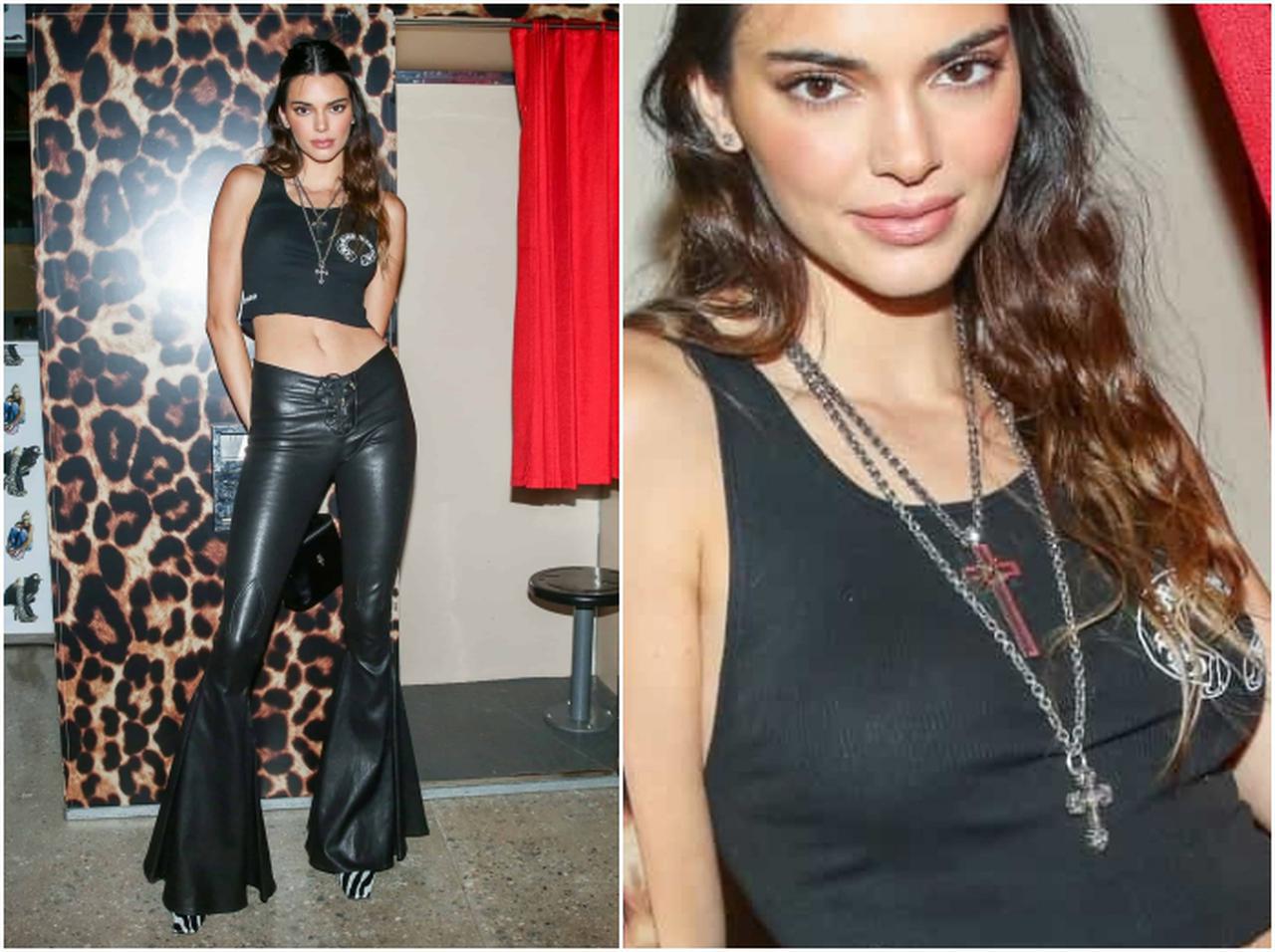 エッジーなスタイルが得意な ケンダル・ジェンナーは、クロムハーツのタンクトップの丈をカットオフして、レザーパンツに合わせたロックな着こなしを披露。